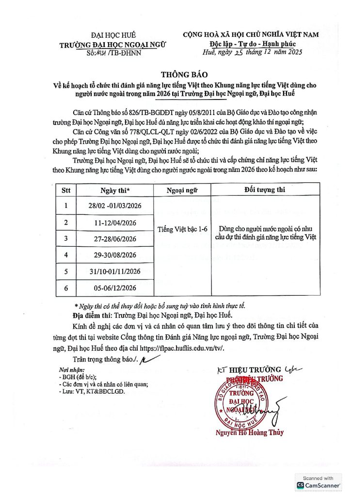 Thông báo về kế hoạch thi Đánh giá năng lực tiếng Việt theo khung năng lực tiếng Việt dùng cho người nước ngoài trong năm 2026 tại Trường Đại học Ngoại ngữ
